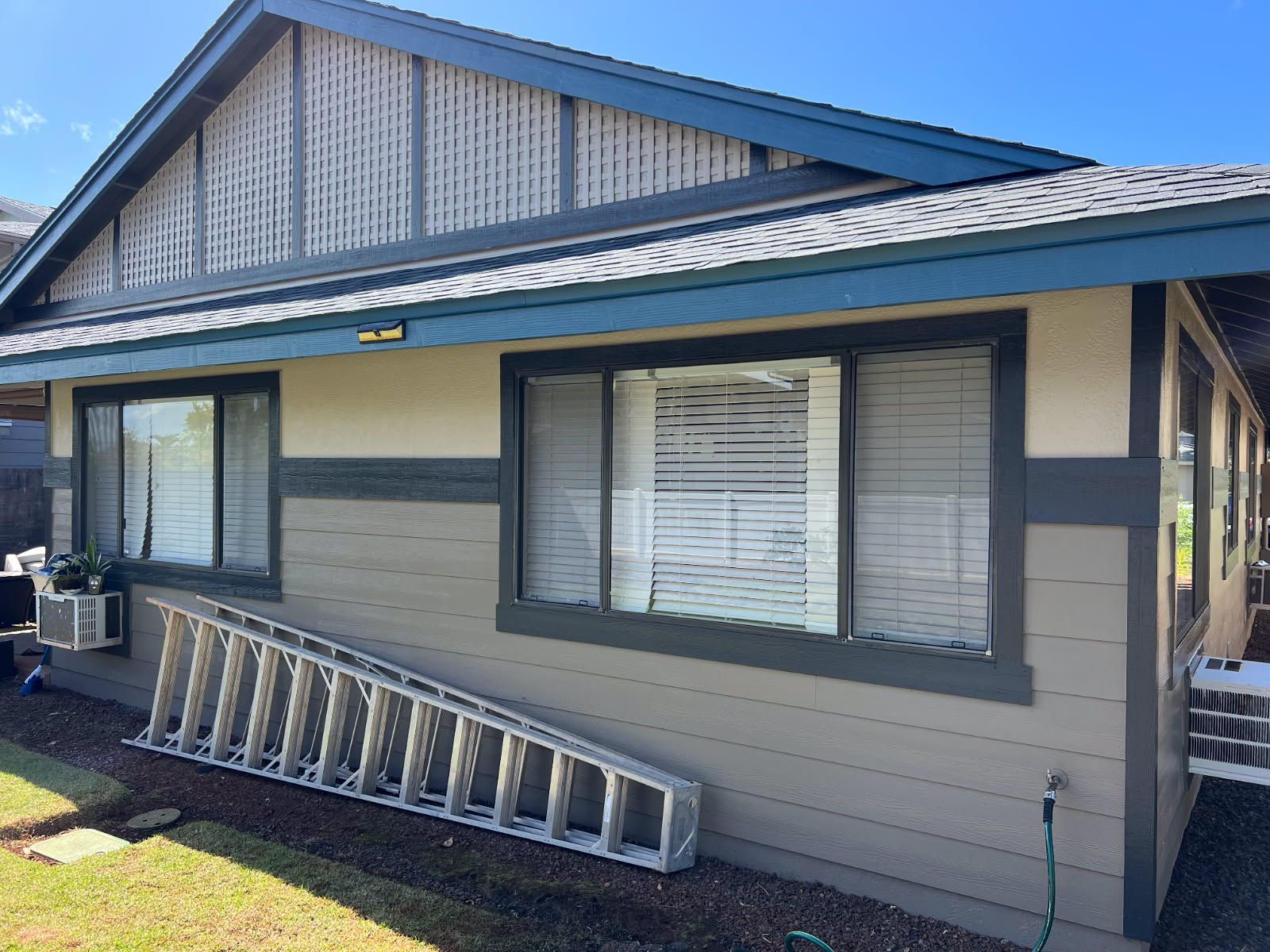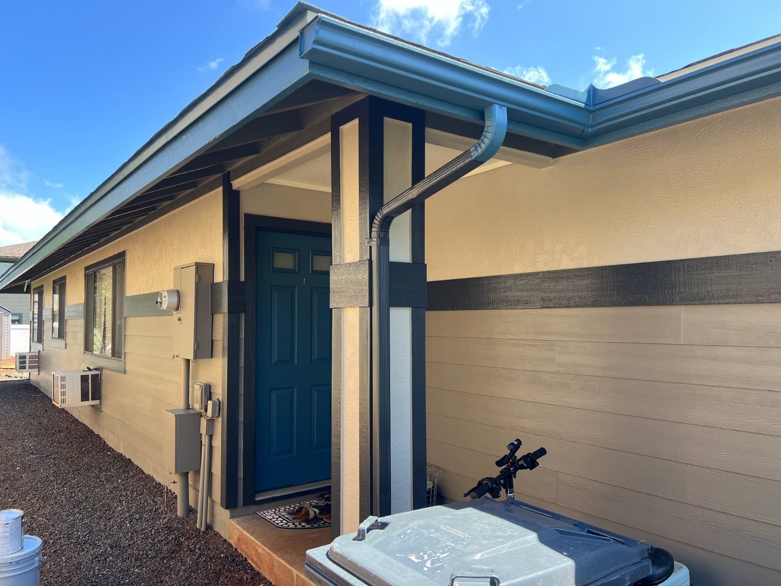 Light blue house with large sliding glass doors and rectangular windows. A pressure washer sits outside on a concrete patio.