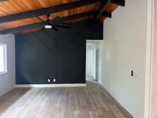 A single-story house with wood siding and a black railing, set against a blue sky